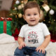 Camiseta de bebê bonita com árvore de Natal, rena e citação engraçada "Muito Bonita Para Vestir Um Suéter Feio". Você pode personalizar este design com o nome do bebê do seu ou do seu ente querido ou remover o nome clicando no botão "Personalizar este modelo". Presente perfeito para chá de fraldas e aniversário.