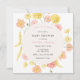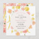 Um charmoso convite de chá de fraldas com flores de aquarela macia em pêssego e amarelo em volta de um elegante layout circular. Perfeito para celebrar uma nova chegada com um delicado e botânico toque.