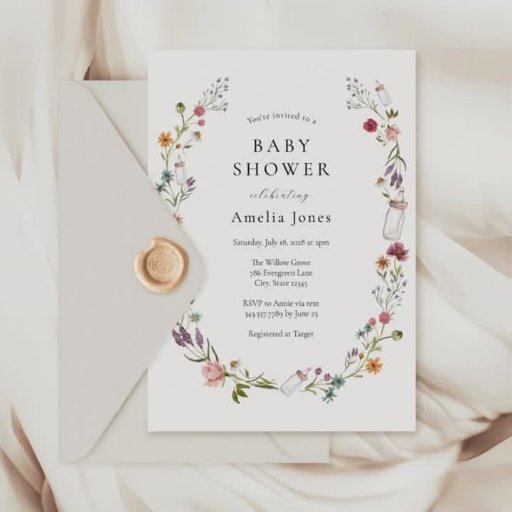 Bebê em Bloom! Este elegante convite de chá de fraldas apresenta uma coroa de água floral com verde e flores silvestres. Personalize com suas informações ou clique em "Clique para personalizar mais" para editar estilos de fonte, tamanho e cores.