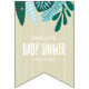 Sobe! Chás de fraldas tropicais com tema de surf, revestidos com uma prancha de fundo natural de grãos de madeira e folhas tropicais em tons de rosa e verde.