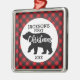 Um bebê bonitinho primeiro ornamento de fotos de Natal. O Enfeites de natal é decorado com um urso e um padrão de xadrez de búfalo. Personalize-o com o nome do seu filho e o ano de um lado e uma foto no verso. Projetado para você pelo Blackberry Boulevard.