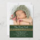 Ouro elegante e cartão com fotos verde de Natal do bebê. Este cartão de Natal de foto verde damask é facilmente personalizado, simplesmente escolhendo o botão "Personalizar!" para começar a adicionar sua foto, detalhes, estilo de fonte, tamanho e cor de fonte e texto.