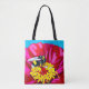 Dual-sided shoulder tote with a vibrant honeybee on a pink flower. Original painting by Courtney Bindl.