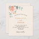 Fundo bege. Decorados com ouro-rosa e folhas de eucalipto cor-de-rosa-esbranquiçada, flores de rosa e cor-de-rosa-esbranquiçada, galhos, verde e borras de ouro. Personalize e adicione seus nomes e detalhes do casamento. Voltar: adicione o URL do site de casamento ao código QR para obter detalhes e/ou RSVP. 1 folha = 1 convite impresso de borda a borda.