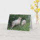 Este cartão de boas-vindas apresenta uma fotografia de um par de ovelhas fofinhas e fofinhas. As ovelhas estão cercadas por flores silvestres e erva comprida e estão paradas debaixo de uma árvore e chegando, comendo algumas folhas de forma cinzenta. Eles têm casacos grossas de lã e rostos muito bonitos.