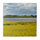 Um campo de canola amarela vibrante floresce sob um céu dinâmico, com manchas de nuvens fluffy lançando sombras na paisagem. Ao fundo, uma banda contrastante de árvores verdes escuras separa o campo de uma extensão tranquila de água. Esta imagem foi tirada perto de Streatham em Victoria, Austrália.