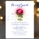 Este convite de festas de Beleza e conto de fadas da Besta apresenta um fundo branco com texto azul real colorido. Uma rosa vermelha mágica brilhante é colocada no centro. O pó de diamante está espalhado pelo rosa, criando um olhar encantador. A frase "Seja nosso Convidado" é impressa em uma fonte do estilo de conto de fadas, branco, acima do rosa.