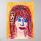 Retrato colorido e engraçado de uma mulher esportando cabelos ruivos enormes em um fundo amarelo. Pastel de óleo e aquarela em papel.