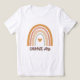 The minimalist, boho-inspired graphic centers around a hand-drawn rainbow in muted, earthy tones: ochre, dusty pink with subtle polka dots, tan, and sage green. A small ochre heart nestles beneath the innermost arch, while the uplifting phrase “CHOOSE JOY” appears below in a playful soft-pink serif font with a subtle outline for a pop-out effect. This versatile tee effortlessly pairs with jeans, leggings, or skirts for a relaxed, Scandi-minimalist look.