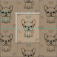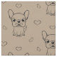 Belo tecido francês para seus projetos de costura e artesanatos criativos. A impressão é feita de ilustrações bonitas, mas adoráveis, de desenho de um buldogue francês e uma multidão de corações doces impressos em volta do filhote doce. O fundo está em uma cor de creme neutra e pode ser facilmente mudado em uma cor diferente para se adequar melhor ao seu projeto. Bom material para quem possui e ama buldocos franceses.