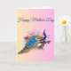 Um belo cartão de Dia de as mães apresenta um belo pavão e uma composição floral com fundo de gradiente pastel. O sentimento de "Dia de as mães feliz" pode ser personalizado ou deixado como. Disponível como cartão impresso e como download instantâneo!