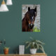 Uma bela fotografia de um rosto de cavalo marrom. Seus grandes olhos cheios de alma estão olhando bem para o espectador desta peça. O pano de fundo parece ser um campo e a cor acentuada é marrom em muitos dos produtos. Ele é tão bonito, que é certo fazer qualquer amante de cavalos e colecionador feliz em receber este presente.