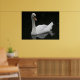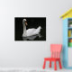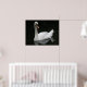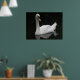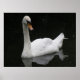Esta poster apresenta uma fotografia de um lindo cisne branco. O cisne é um cisne macho, pode-se dizer que é macho pela batida negra no bico. O cisne está deslizando graciosamente através da água em um lago calmo.