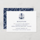 A placa de receptáculo de recepção no estilo costeiro apresenta os detalhes da sua recepção de casamento em azul marinho, acentuado com uma ilustração de âncora desenhada manualmente com as suas iniciais em dentro. Cartões que se deslocam a uma corda náutica de cor branca, em marinho. Projetado para combinar com a nossa coleção de convites de casamento bem ancorados.