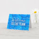 Cartão azul de boas-vindas para novos funcionários, parceiros de negócios ou clientes na empresa apresenta a frase "Bem-vindo à equipe" na frente. O dentro pode ser personalizado com sua própria mensagem. Pode também ser dado a novos jogadores de uma equipe desportiva.