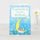 Parabéns no seu novo bebê, pegadas de bebê, bebê dormindo na lua verde e cartão de estrelas azul para novos pais. Este bebê de desenho tem uma pele ligeiramente mais escura para bebês de cor como hispânico ou indiano.