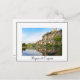 Cartão postal com o castelo e a aldeia de Beynac-et-Cazenac construída sobre os penhascos ao lado do rio Dordogne no início da manhã, com reflexo no rio e um caiaque no primeiro plano. A cidade está situada no perigor, na França. Tem uma fronteira branca e o texto: "Beynac-et-Cazenac".