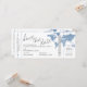 Passagem de Embarque Salve a data Cartões de Bilhete do Avião em um elegante design moderno com uma cor azul-d-água poeirenta, mapa mundial de cor-d-água, design de tema viagem. Todas as cores de texto e fundo são editáveis para que você possa criar seu próprio design usando este modelo para um cartão de embarque único que foi projetado com um casamento de destino ou um casamento do tema viagem ou uma celebração de renovação de votos em mente. Visite as Coleções do Designer de Destinos de Fita de Papel para coordenar itens.