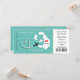 Um convite de casamento divertido e elegante em estilo de cartão de embarque/bilhete para casais que se casam no exterior, na bela ilha grega de Santorini, mostrada em uma silhueta de mapa branco sobre azul turquesa com corações de amor vermelhos, silhueta de avião e formato de coração girando. O verso tem muito espaço para detalhes extras e uma foto pessoal.