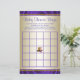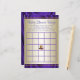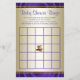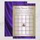 Jogo de bingo de chuv de bebê com adorável bebê menina vestindo um lindo tutu roxo e colar de pérolas em um par de sapatos elegantes de salto alto dourados em um fundo rico em roxo e dourado. Este cartão de jogo de bingo de chuv de bebê é facilmente personalizado com seu texto.