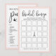 Cartão de jogo de chuveiro de noiva elegante combina com nossa coleção de chuveiro de noiva Paris Romance e apresenta letras em script preto caprichoso e bordas rosa suave com torre Eiffel e pequenos detalhes de pássaros. Cartão de dupla face permite que você obtenha dois jogos em um! A frente apresenta Bingo de Noiva e o verso apresenta O que está na sua Bolsa. Personalize com o nome da noiva e a data do chuveiro.