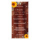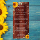 Cartão de menu de festa de aniversário. Personalize e adicione um nome, idade, data e menu. Madeira marrom-russa como fundo, decorada com pó de dourado falso, girassóis de cor aquosa e verde de eucalipto. Letras pretas coloridas.