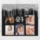 For a 21st (or any age) birthday party, celebrating her life with a collage of 5 of your own photos. Personalize and add a name, age 21 and a date. Date of birth or the date of the party. White and golden gray letters. Classic black background color, decorated with faux silver glitter drips, paint dripping look.