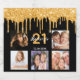 For a 21st (or any age) birthday party, celebrating her life with a collage of 5 of your own photos. Personalize and add a name, age 21 and a date. Date of birth or the date of the party. White and golden colored letters. Classic black background color, decorated with faux gold glitter drips, paint dripping look.