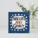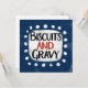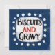Uma design comida de Sul divertida e fofa que diz "Biscoitos e Gravidade". Ele tem texto preto e vermelho em um retângulo branco com pontos brancos engraçados e brincalhões ao seu redor, tudo em um fundo azul.