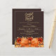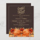 Uma cor de fundo castanha escura. Decorou um grande arco laranja e caiu flores. Personalize e adicione os detalhes da festa. Script de texto: Grateful e abençoado. 1 folha = 1 convite impresso de borda a borda.