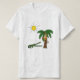 Macaco engraçado dos desenhos animados em uma palmeira com o crocodilo engraçado abaixo e o sol atrás do design do t-shirt. Excelente para a praia.