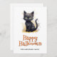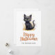 Feliz cartão de Halloween com ilustrações de aquarela de um gato preto, fantasmas e jack o’lanterns. Personalize facilmente este cartão de Dia das Bruxas fofo para crianças com seu nome e texto de família.