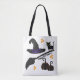 Saco branco de tote para o Dia das Bruxas com design de gato preto divertido. Adicione o nome da criança com o texto "quer doce" Um gato preto com olhos verdes decora ambos os lados da bolsa. Uma vassoura-bruxa e chapéu, juntamente com abóboras e milho doce, decoram a frente. O texto angloriado diz: "Feliz Dia das Bruxas".
