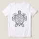 A sea turtle depicted in a black geometric wireframe style, composed of interconnected triangles and polygons. The figure is shown from a top-down perspective against a solid white background.