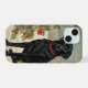 Um Labrador Retriever preto senta-se numa cena de inverno nevado, emoldurado por ramos sagrados com frutas vermelhas. O cachorro tem uma coleira vermelha e olha diretamente para o espectador com uma expressão calma e digna. O fundo apresenta uma floresta nevada com ramificações negras e uma paleta de cores suave e suave. A imagem evoca um sentido de tranquilidade e a beleza do inverno.