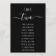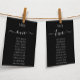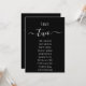 In the upper part, there is the table number written in a handwriting script and the word Table above, in smaller caps (hand letters). Under them, there are the 10 guest names, in similar hand letters. The background is black, all text is white.