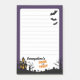 Este posto personalizado assustador apresenta um tema lúdico do Dia das Bruxas com uma fronteira roxa profunda, enquadrando uma área branca, forrada para fácil tomada de nota. O canto superior direito é assombrado por três morcegos voadores negros, enquanto o fundo é enfeitado com uma silhueta assustadora de uma casa assombrada com janelas laranja brilhantes, árvores sem folhas e cruzes de cemitério tortas. No centro da base, a frase "Trick or Tratat" pop em uma fonte laranja divertida e ousada. Totalmente personalizável, este posto permite que você mude o nome, o fazer de uma papelaria sazonal perfeita para festas de Halloween, anotações temáticas ou lembretes festivos.