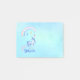 Notas pegajosas com uma bela ilustração. Um unicórnio aquarela parado debaixo de um arco-íris com estrelas bonitinhas balançando. A tipografia diz Acredite.