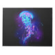 Água-viva grande, azul, desenhada artisticamente, brilhante, brilhante, com longos tentáculos sobre fundo preto com bioluminescência roxa. Água-viva luminosa.