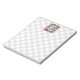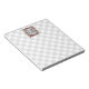 Bloco de notas de 5,5" x 6" com uma imagem de uma cinza e de um quadro branco de xadrez e uma imagem vintage Alice no País das Maravilhas da Alice no pátio da Rainha do Coração com um quadro preto e branco de pranchas de xadrez em um fundo de cartas de jogar em vermelho. Veja toda a coleção Wonderland Notepad nos TOUCHES ESPECIAIS | Seção Favoritos para festas.