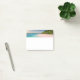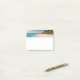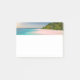 Sticky notes with a beautiful photograph. A scenic tropical beach with aquamarine water and a white sandy beach with a lush forest in the back. A solitary umbrella available for those who love seclusion.