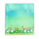 Um bloco de notas forrado para a estação do outono, com abóboras-fantasma brancas e peras desenhadas com tinta e pintadas com aquarela num fundo azul, verde e amarelo de lavagem com aquarela.