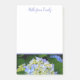 Vazio branco poste-o com texto no topo e um botão de hydrangea azul no fundo. Personalize com um nome ou uma linha curta de texto em um script azul roxo ao longo da parte superior das notas de 4x6 polegadas que vêm em um pad. Folhas verdes e uma flor azul de hydrangea florescente decoram o fundo do papel.