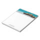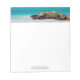 Notepad com uma bela fotografia. Uma praia branca arenosa, com um surf gentil. A água turquesa tropical rodeia uma rocha agitada.