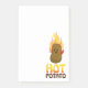 Um desenho animado de batata marrom com um sorriso grande e feliz, pontos para os olhos e paus para os braços. Ele está rodeado de chamas amarelas e cor de laranja queimadas. Abaixo dele, em texto laranja e amarelo, encontra-se a palavra HOT e abaixo dela, em texto castanho, está a palavra POTATO. Diversão de design para rir.