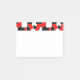 Este bloco de notas Poste tem um design de Bauhaus de triângulos, círculos, retângulos e pentágonos a preto e branco num campo de vermelho.