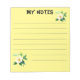 Um bloco de notas amarelo claro com linhas verticais pretas e uma ilustração mostrando uma flor bonita como pintura aquosa no canto superior direito e inferior esquerdo.