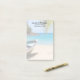 Notas pegajosas de casamento com uma cena de praia tropical idílica. Água clara de cristal azul turquesa e uma praia arenosa castanha macia. Algumas folhas de palma penduradas de cima. Um velho barco a remo de madeira fica sentado na praia. Uma paisagem serena e pacífica.