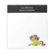 Um bloco de notas com uma imagem de um unicórnio Frankenstein. Cor roxa e verde. Muito fofo.