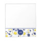 Este bloco de anotações temático de futebol divertido apresenta esferas azuis, douradas e brancas de futebol dispostas aleatoriamente de tamanhos variados na sua borda inferior com nome e monograma fáceis de personalizar em um pendante comum de círculo azul mais número de camisa em uma das bolas de futebol - por katz_d_zynes